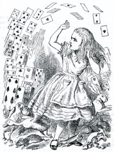 Prieš keletą metų man užėjo TOKIA Alisos manija, kad net sunku pačiai suprasti. Tiesiog Alisa Stebuklų šalyje yra puiki metafora mano pirmiesiems metams doktorantūroj: viskas atrodė keista,retas sugebėjo man paaiškinti kai kurias nesuprantamas taisykles, ir daugelis įvykių ir žmonių atrodė tarsi iš stebuklų pasaulio. Garbės žodis, vienas profesorius buvo tikra Češyro katino kopija, o kolega doktorantas- baltasis triušis – toks visada tik pro šalį prabėgantis (“Neturiu laiko su jumis kalbėtis- RAŠAU DISERTACIJĄ”), “pasikėlęs” ir bandantis sudaryti labai svarbaus triušio… , oi atleiskite, doktoranto įspūdį.