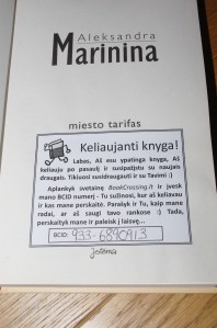 Kitą kartą, kai nuėjau į MIntVinetu, o nueinu, kai tik einu pro šalį, nusėlinau (tikrąja ta žodžio prasme) prie lentynos pažiūrėti, ar kas nors vietoj manęs “pavogė” knygą. 🙂 Aha, nepavogė. Įdomu. Bet kainos vis dar nėra. Tada paklausiau kitos knygų barmenės ir ji patvirtino, kad čia Bookcrossing knyga, kurią galiu neštis nepavogdama, jei tik noriu. Tada jau man atsivėrė akys ir pamačiau visus užrašus ir skiriamuosius ženklus. Vienas moralas man sukasi galvoje: VISADA ŽIŪRĖK IŠPŪTUS AKIS, DAIRYKIS IR KLAUSK, KAI NEŽINAI! Gal man ant delno užsirašyti ir laikas nuo laiko perskaityti, kad nepamirščiau?