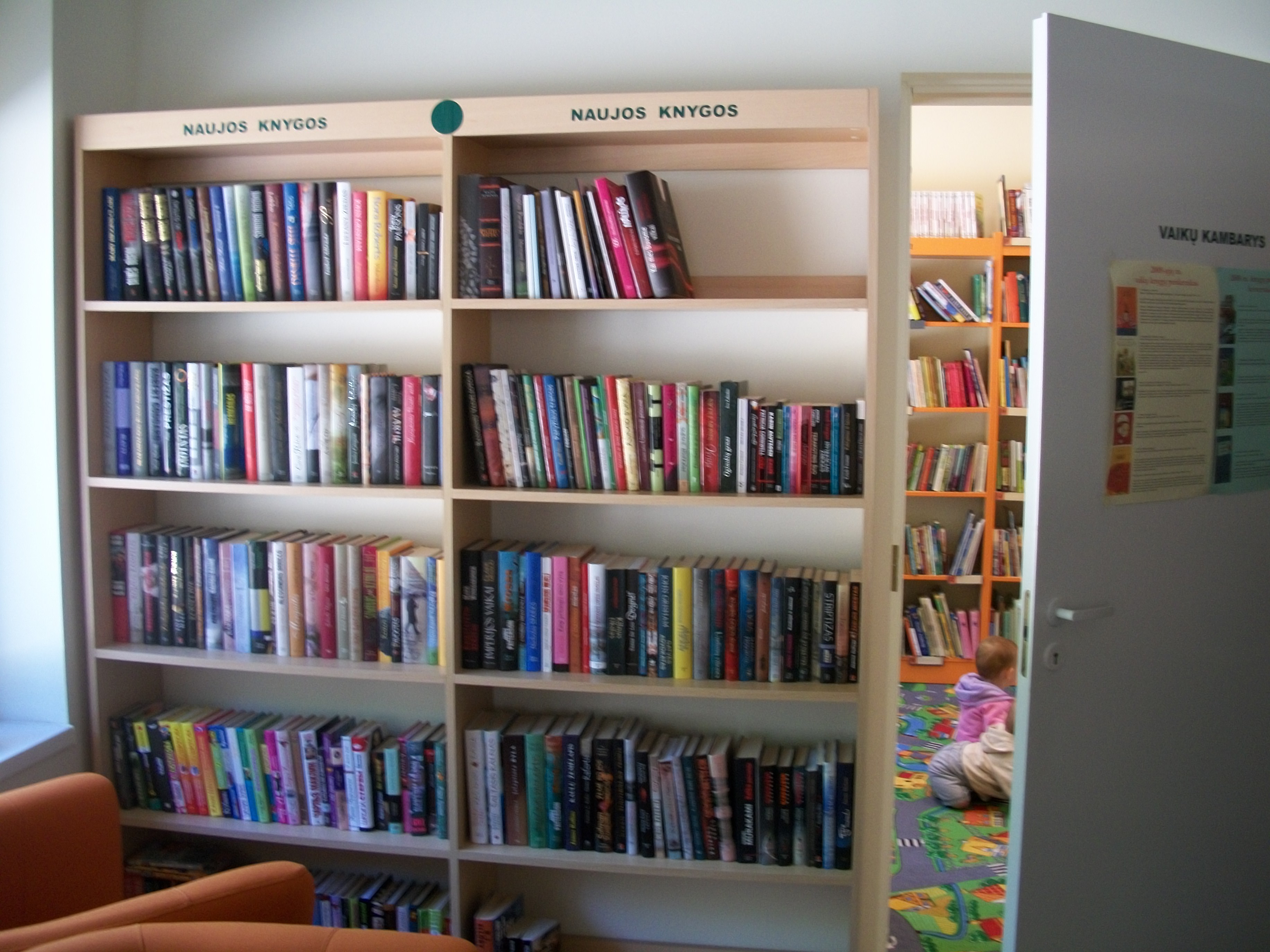 Naujų knygų lentynos. Už durų - vaikų kambarys