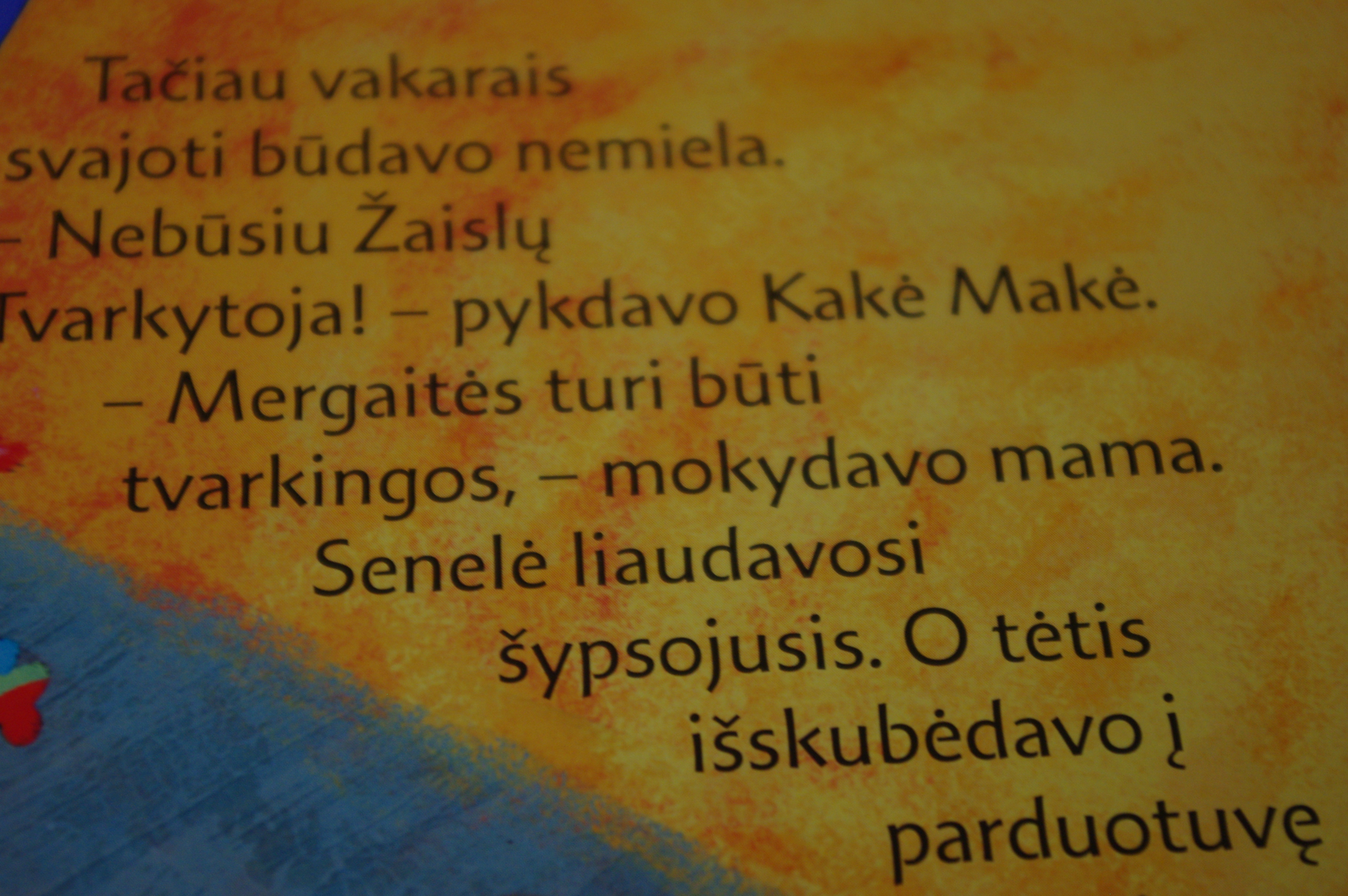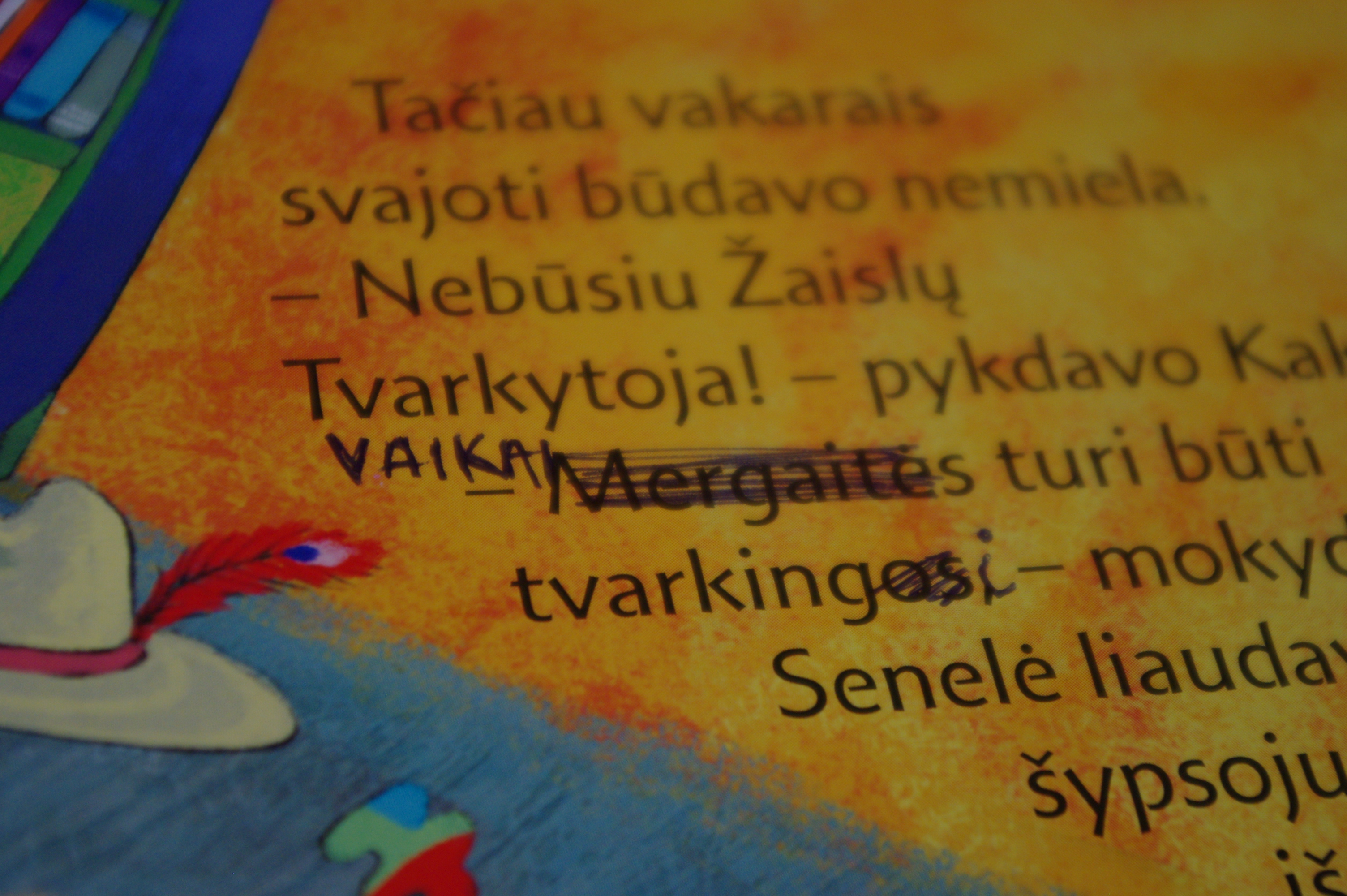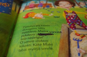 Pažiūrėkit, ką paskė mama: “Mergaitės taip nesielgia”. Kas čia per posakis? O, ką berniukai elgiasi? RRRRR!!! Todėl skaitydama, blefuoju ir skaitau kitaip, o kad tėvelis nesuklystų skaitydamas, dar ir pataisau. Va taip, žiauriuoju būdu!