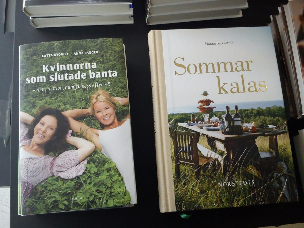 Nagrinėju toliau. Šalia jau minėtos ant stalo guli “”Moterys, kurios nustojo laikytis dietų. Maistas, treniruotės ir mindfulness po 45erių”. Komentarai nereikalingi. Šalia- “Sommarkalas”, receptų knyga apie vasariškas švediškas šventes, apie “šventes sode ir vakarienės stalus, padengtus baltomis išlygintomis nėriniuotomis staltiesėmis, ir, žinoma, apie tai, kaip mirkome braškes šampane prieš valgydami vasarišką maistą po obelimis“.