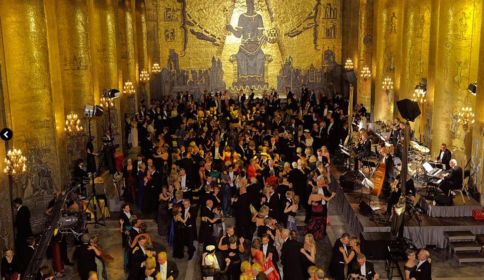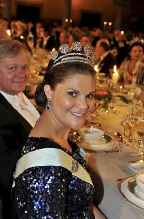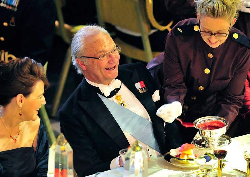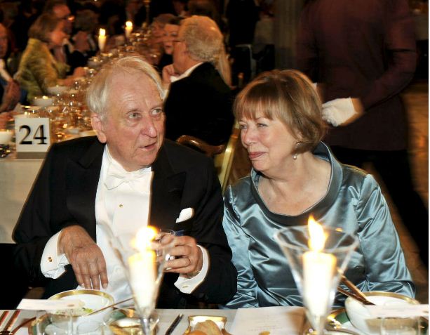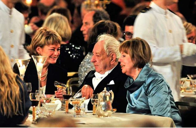 T.Transtromer Nobelio vakarienės metu. Šalia jo sėdi jo žmona Monica. Pagal etiketą žmona ir vyras vienas šalia kito per Nobelio vakarienę nesėdi, bet kadangi T.Transtromer po 1990 metais patirto insulto labai sunkiai kalba, tai jo žmona sėdi šalia