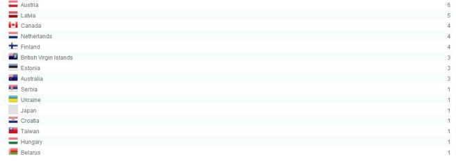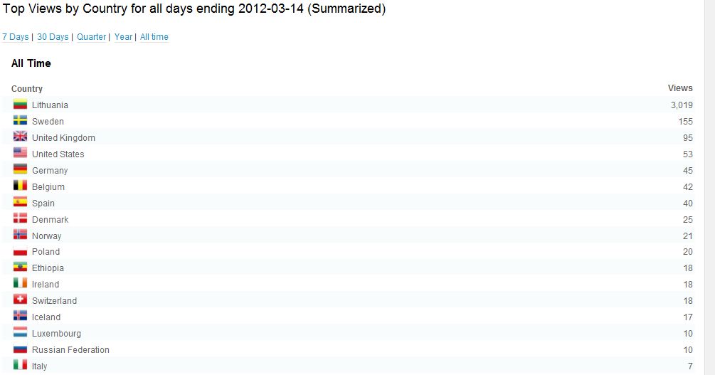 Giedrė paliudys, kad man patinka ne tik knygos, bet ir geografija. WordPress sugalvojo įdėti mus lankančiųjų statistiką pagal šalis. Spėkit, kokios kokiose trijose šalyse (be Lietuvos, aišku), gyvena mūsų blogo draugai ir draugės? Visų blogo gyvavimo laikų statistika (OMG, British Virgin Islands!):