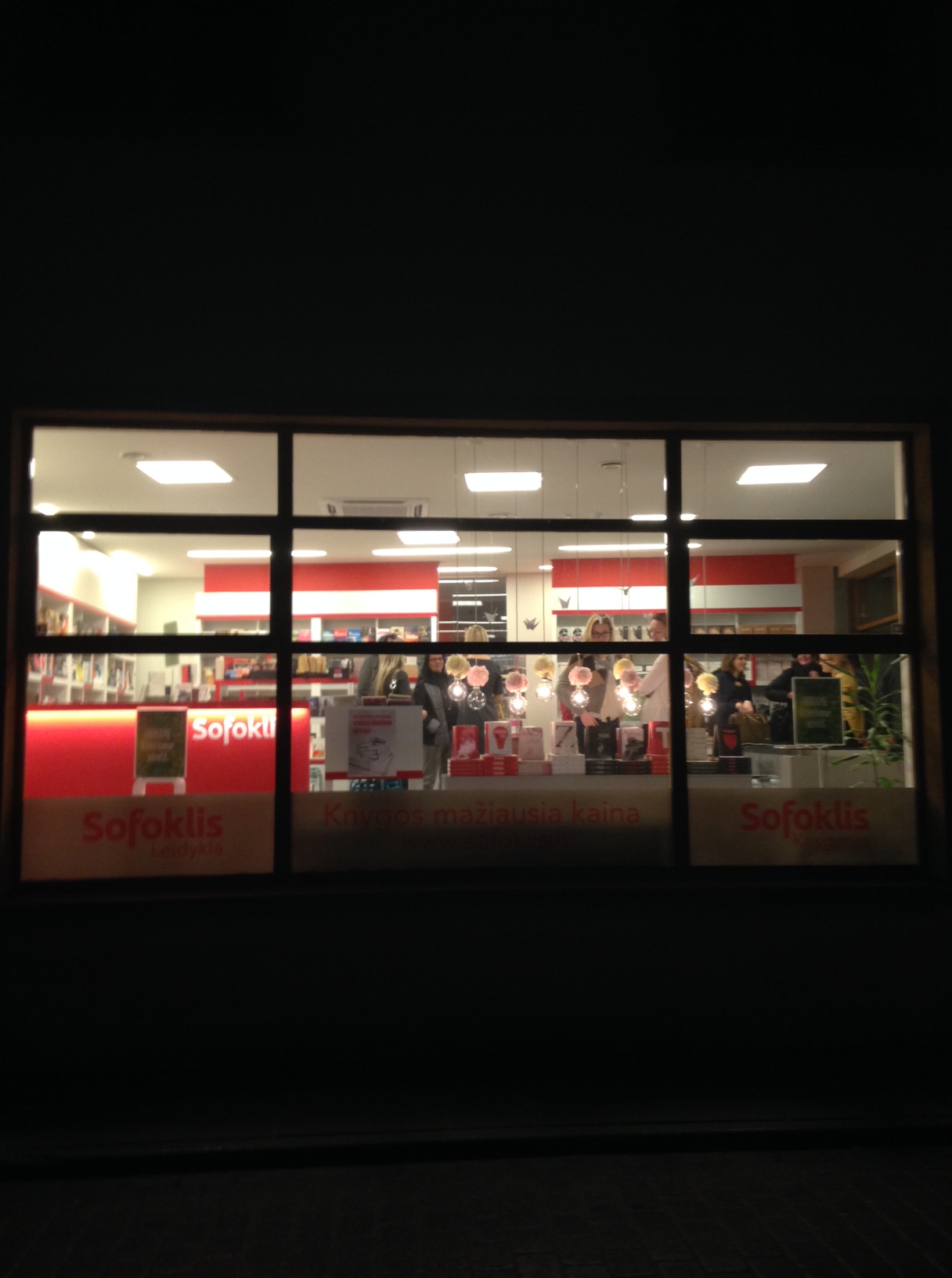 Kažkada vakare važiuodama Klaipėdos gatve, pamačiau labai gražų langą. Jau žinojau, kad langas yra Sofoklio knygyno. Toj gatvėj nelabai yra vietos sustoti ir bėgti fotografuoti – taip ir nuvažiavau su tuo vaizdu galvoje. Bet vakar turėjau progą ramiai nufotografuoti, nes Sofoklio knygyne buvo pokalbis/susitikimas, susijęs su L.Binet knyga “HHhH“.