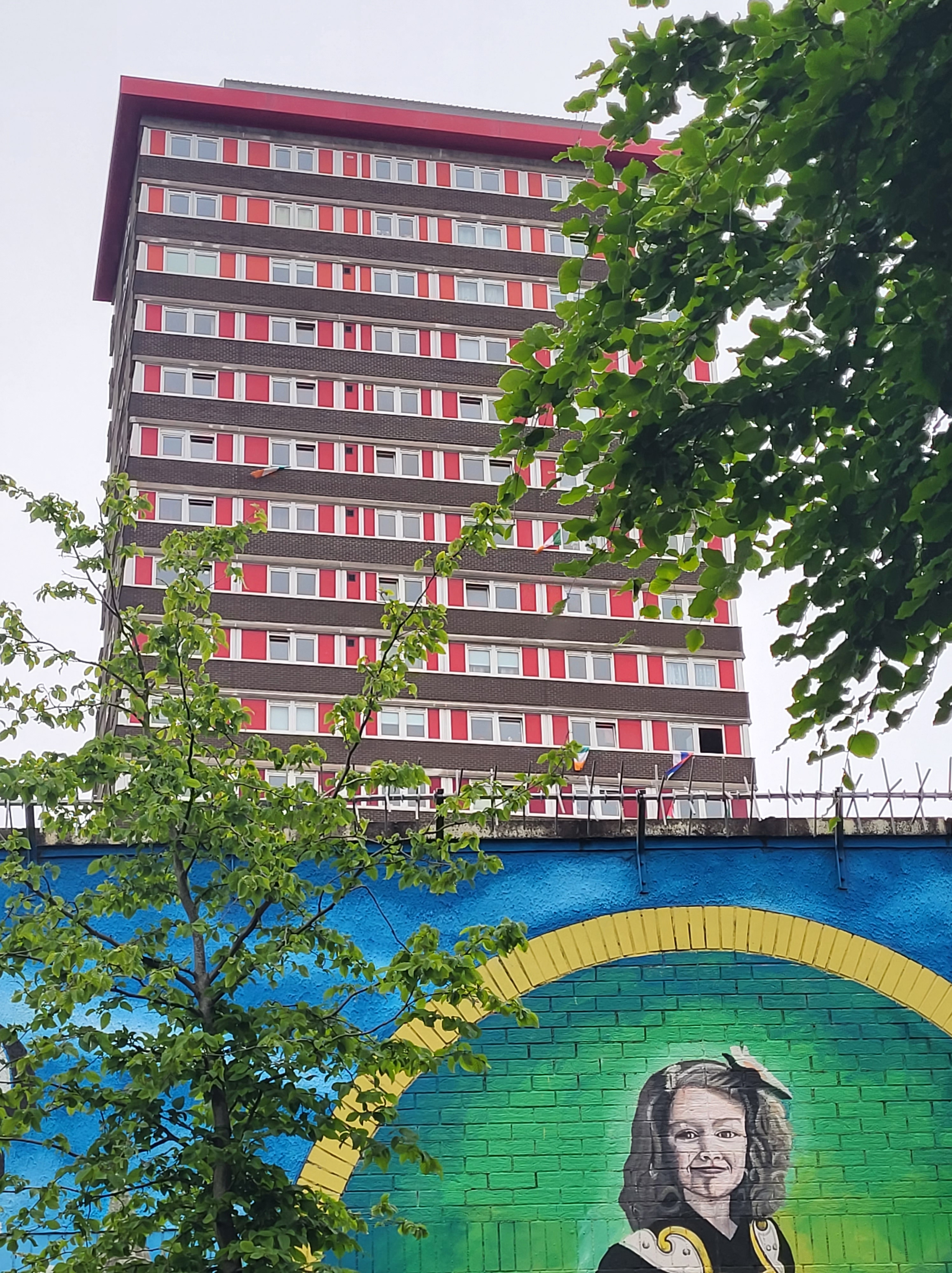 Divis Tower, kuriame gyveno išvaryti katalikai, o viršutiniuose aukštuose buvo įsikūrusi britų kariuomenė ir snaiperiai. Toliau – murals, sienos, vis dar naudojami vartai.