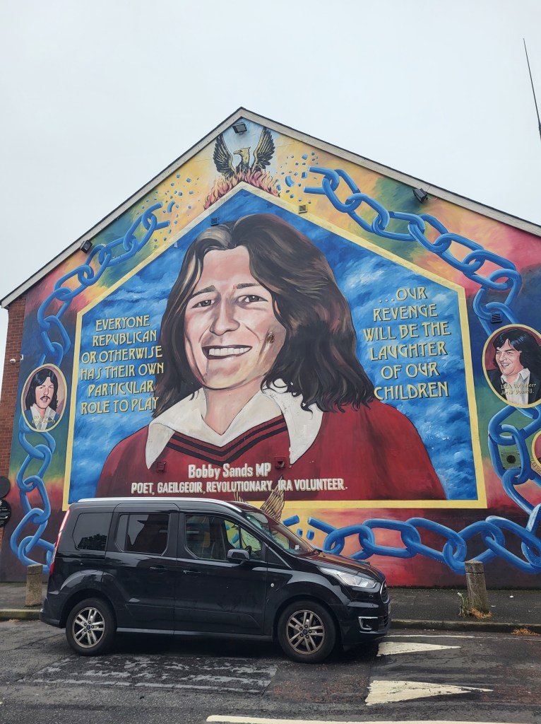 Kad suprasti šio konflikto ištakas, reikia keliauti į 1600-uosius, galima įsivaizduoti, kiek čia istorinio palikimo, žaizdų, traumų, politikos žaidimų. Bet grįžkime į Black Cab. Savo taksi vairuotojo vardo nebepamenu, bet labai dažnai jis savo istoriją pasakodavo sėdėdamas už vairo, nes tiesiog negali to daryti stovėdamas prieš žmones, vis dar per daug jautru. Pirmą kartą policijos buvo sučiuptas gatvėje budamas vos septyniolikos, buvo tardomas ir kankinamas ir du metus praleido kalėjime be jokių konkrečių kaltinimų ir teismo. Antrą kartą kalėjime atsidūrė dėl ginklo laikymo ir kalėjime praleido, jei teisingai supratau, 3.5 metų iš 7. Kartu su kitais suimtaisiais atsisakydavo dėvėti kalėjimo rūbus, taip protestavo prieš tai, kad buvo laikomi kriminaliniais nusikaltėliais. Skelbė esą politiniai kaliniai. Ką dėvėdavo? Nieko. Būdavo susisupę į paklodes. Metų metus. Badaudavo reikalaudami minimalių teisių gauti siuntinius iš šeimų, susitikti su artimaisiais. Nuo bado mirę kaliniai – piešiniuose ant sienų.