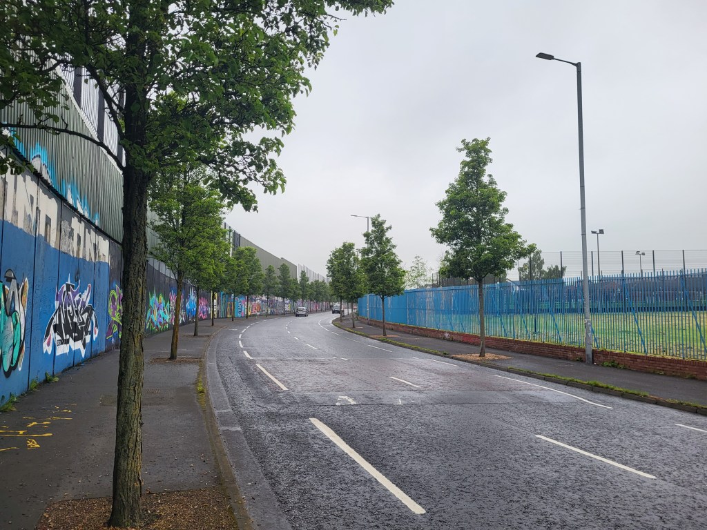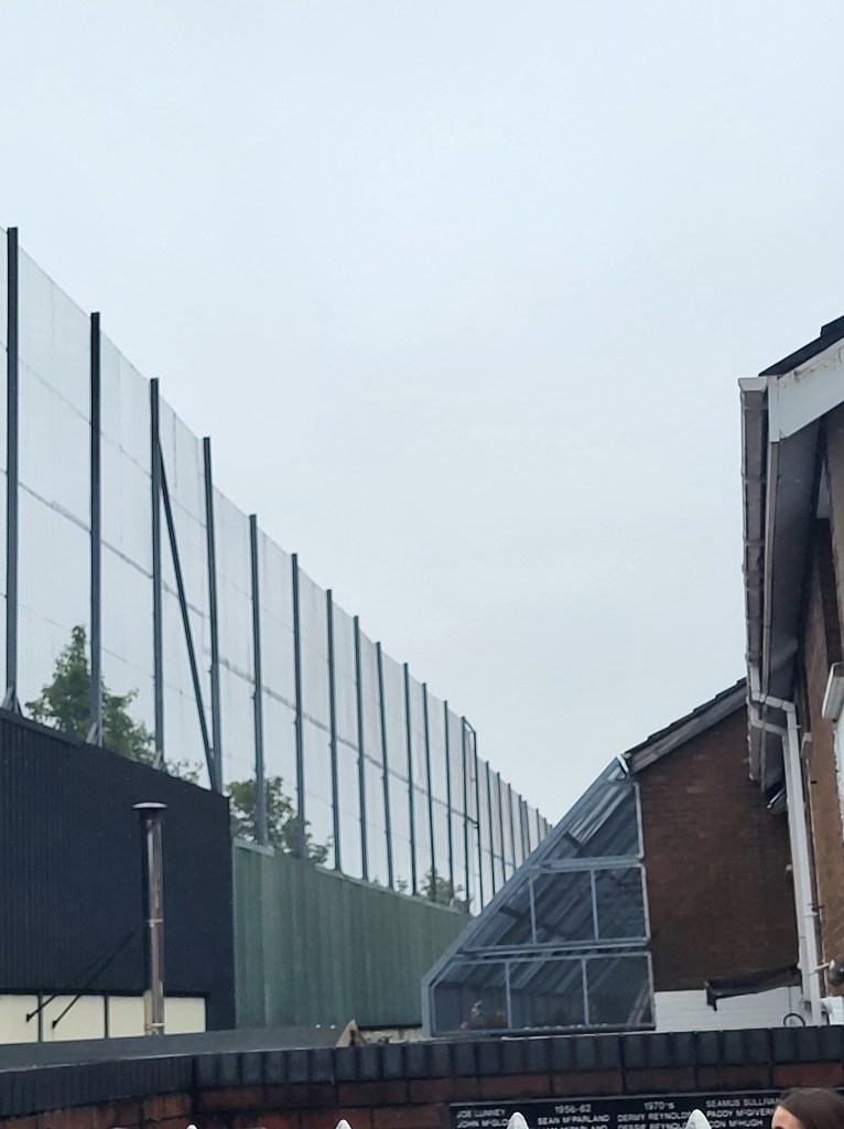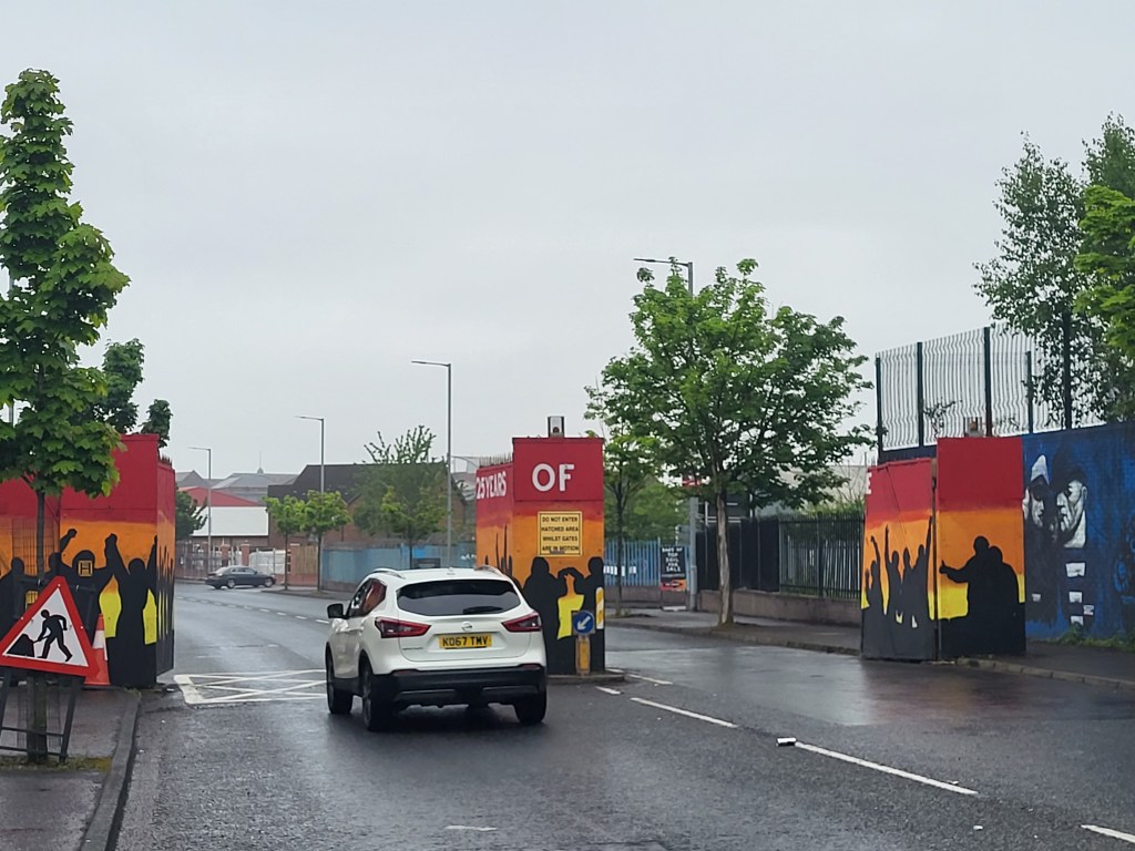 Niūri ekskursija. Labai nejauki. Neįtikėtina, dėl to, kad respublikonų-katalikų ir unionistų-lojalistų-protestantų gyvenamuosius rajonus vis dar skiria aukštos tvoros, kad septintą ryto ir septintą vakaro atidaromi/uždaromi vartai, skiriantys šiuos rajonus, ir virš 85 procentų gyventojų nenori, kad tvoros būtų panaikintos. Beje, sienos tarp Šiaurės Airijos ir Airijos respublikos nėra, valstybes skiria tik raudonais dažais nutaškytas ženklas – po Brexito Šiaurės Airija liko Europos Sąjungos muitų zonoje.