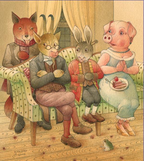 Žodžiu, vilkas bando išgąsdint kaimynus, ale tie tik juokias iš neišsilavinusio vilko arba iš viso nekreipia į jį dėmesio. Vilkas baisiausiai supyksta ir eina mokytis skaityti.