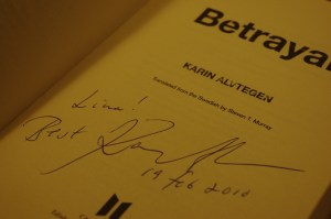 Esu baisiai laiminga, kad pavyko pabėgti į šiandien planuotą susitikimą su Karin Alvtegen. Man visada labai gaila, kad susitikimai vyksta tik vieną valandą – su vertimu grynos kalbos gaunasi vos pusvalandis koks :(. Likau labai patenkinta, autorė – labai šiltas ir mielas žmogus, beje, Astridos Lindgren giminaitė, Karin senelis – Astrid brolis. Autorė minėjo, kad būtent Astrid pavyzdys ją išmokė gyventi su šlove, neįsileisti jos į dušią.