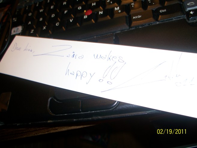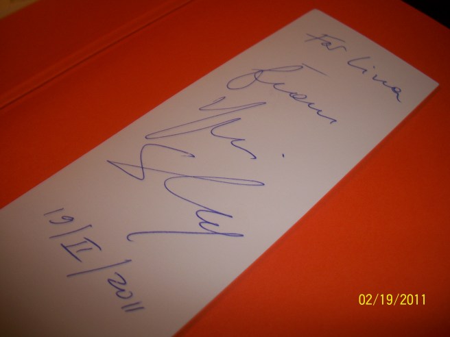 Šis autografas Catalin Dorian Florescu. Jo knyga dar tik gimsta, o jos gimstančios ištraukas skaitė Sigitas Parulskis. Labai patiko. Vėlavau į šitą susitikimą, nežinojau, ką čia skaito, pradėjau klausinėt šalia sėdinčių žmonių, jie irgi nežinojo. Kai pamatysite knygynuose knygą “Zaira”, rėkite man čia visais įmanomais kanalais, labai noriu tos knygos ir jai labai pasisekė, nes ji turės autoriaus autografą. Irgi ant skrajutės ir dar su kažkokia užuomina!