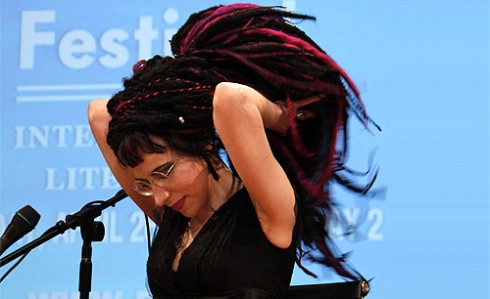 Kadangi Giedrė taip laukia, tai rašau ne iš eilės. Truputį su fotiku bandžiau filmuoti, tai galite šiaip pažiūrėti dėl bendro vaizdo, nes garsas tai nieko gero. Žinoma, rašytojos išvaizda yra išskirtinai įspūdinga – visas tas plaukų-raištelių-dredų balaganas, bet be jo tikriausiai jos net neįsivaizduotume ir nepažintume. Pagalvojau garsiai, kaip ji su tuo klatūnu miega, o šalia sėdėjusios merginos pasvarstė, kad gal tas visas reikalas nusiima?