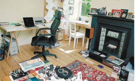 Ian Rankin: “The pair of handcuffs were a gift from a friend who used to be a copper in the 1970s. The trees outside the window belong to our neighbours, and I believe they’re about to chop them down. If I knew anything about antique fireplaces, I’m sure I could tell you something about those tiles – but I don’t, so I can’t. I always have music playing when I’m working, and from the CD cases on the floor it looks as if my choices that day were Julie Fowlis, Magazine, Steven Lindsay and John Martyn. I always think of myself as a tidy sort, but this photo gives the lie to that. There is, however, method in the seeming chaos. Trust me.”